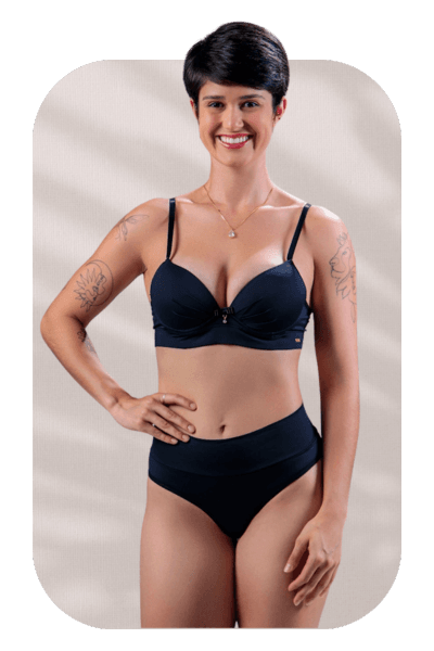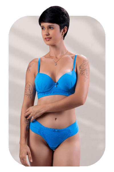 Conjunto de lingerie com bojo drapeado em pregas, acompanhado de base reforçada e fecho triplo, proporcionando firmeza, sustentação e elegância.