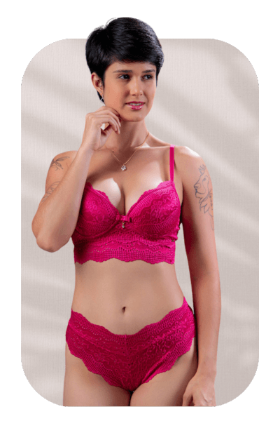Conjunto de lingerie em renda trabalhada, composto por sutiã de base alongada e bojo estruturado, que oferece sustentação e valoriza o busto com delicadeza.