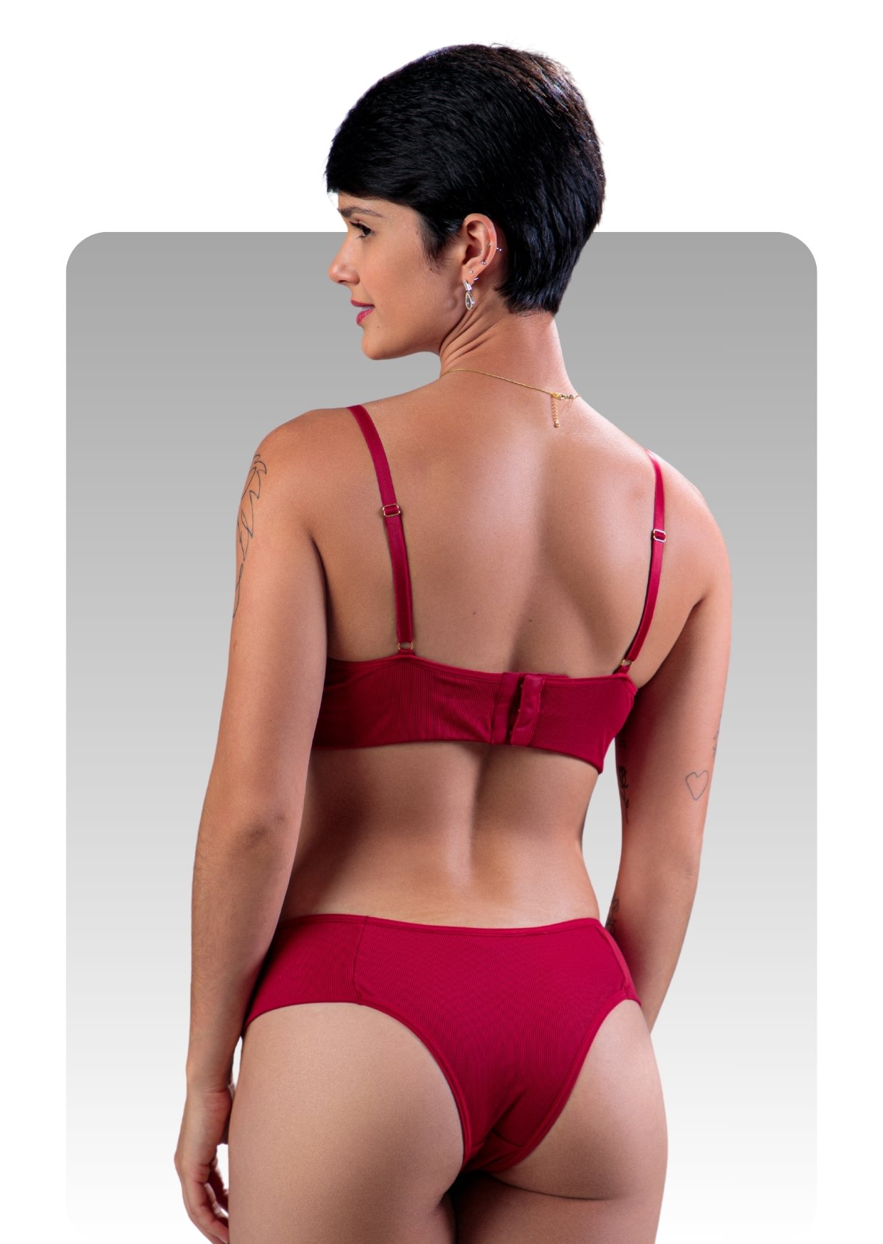 Conjunto confeccionado em tecido canelado, ideal para o uso diário. O sutiã possui base com elástico encapado para melhor sustentação e fecho triplo que proporciona ajuste seguro, a calcinha modelo tanga conta com pala embutida na cintura, garantindo conforto e ótima adaptação ao corpo.